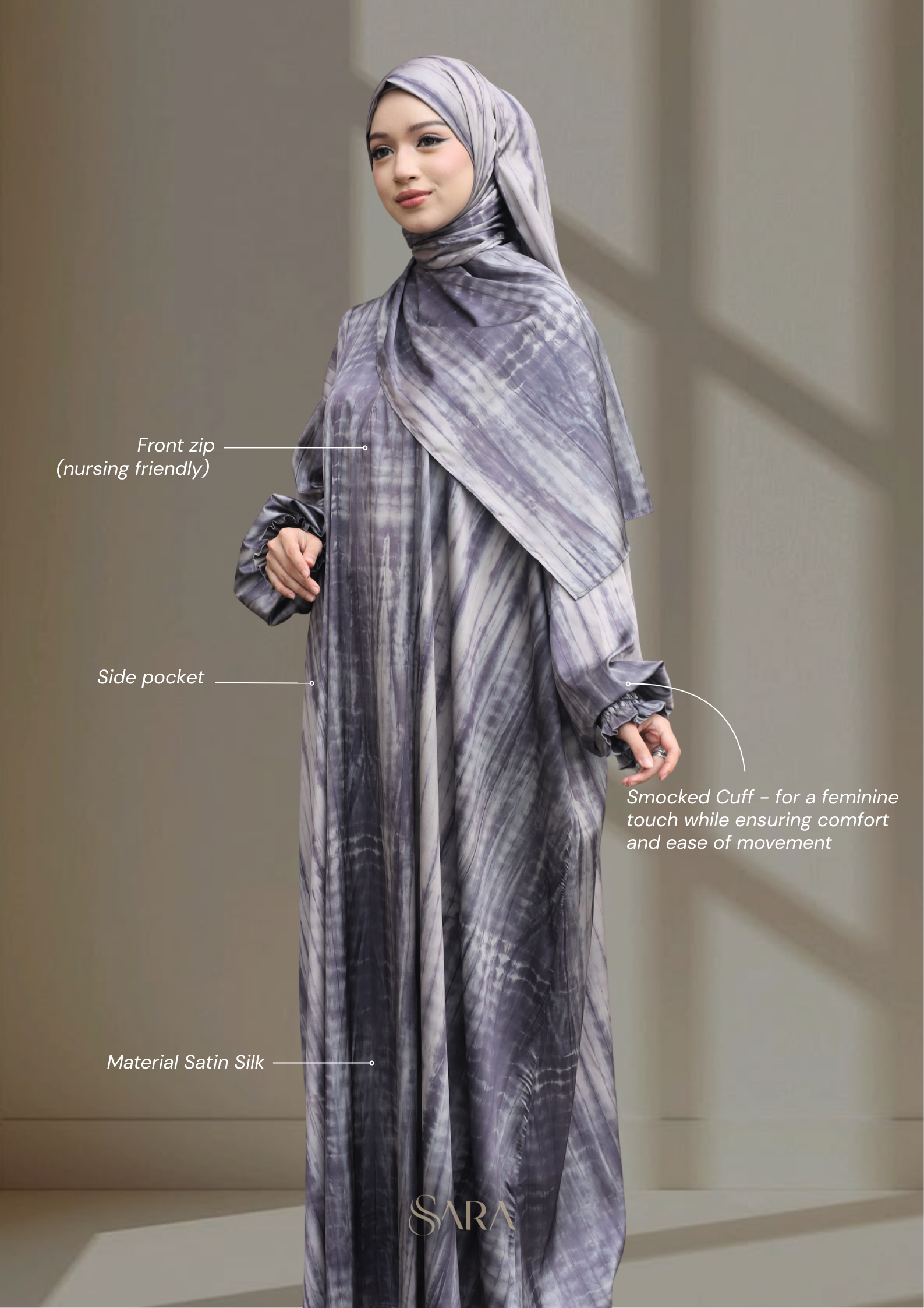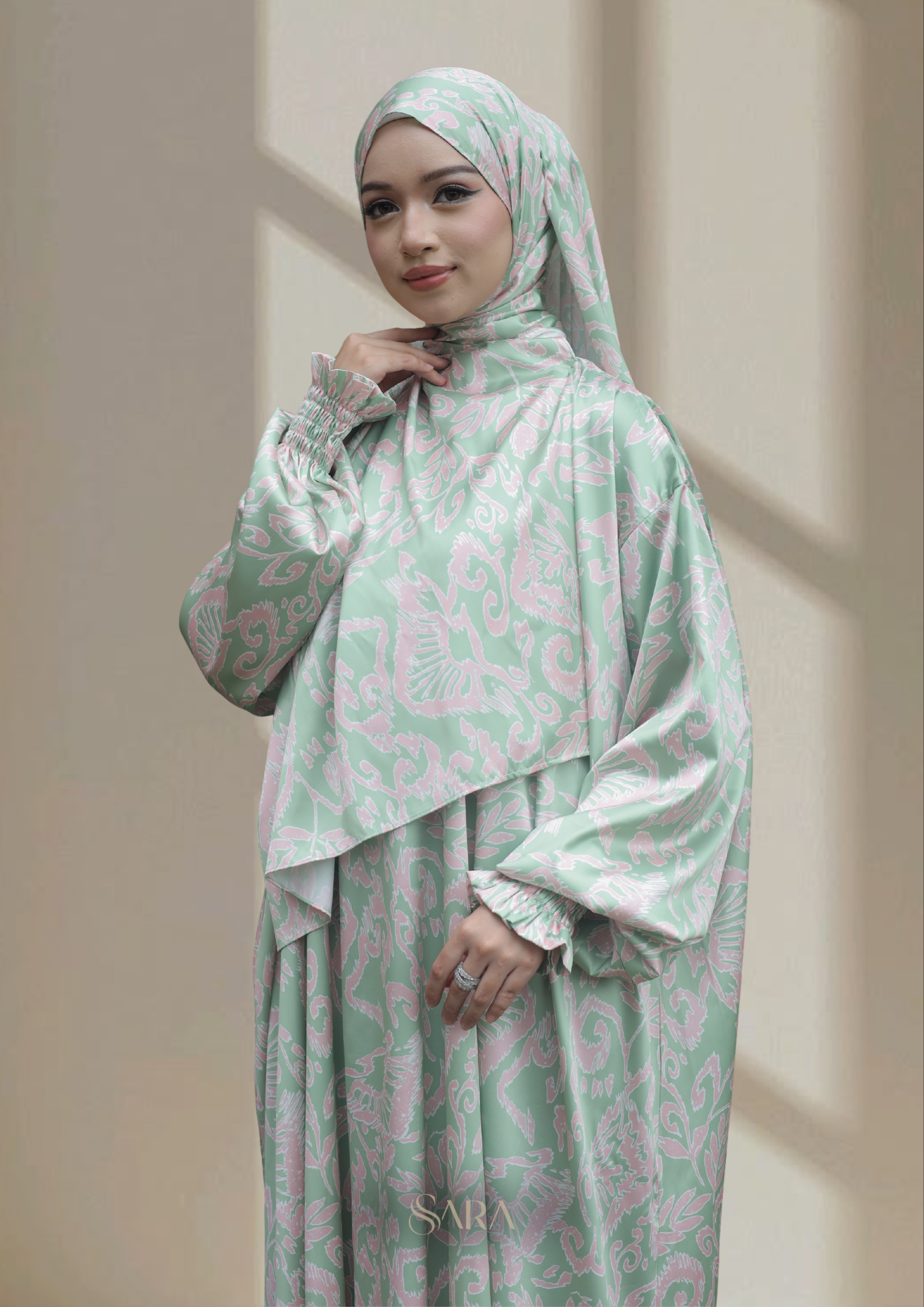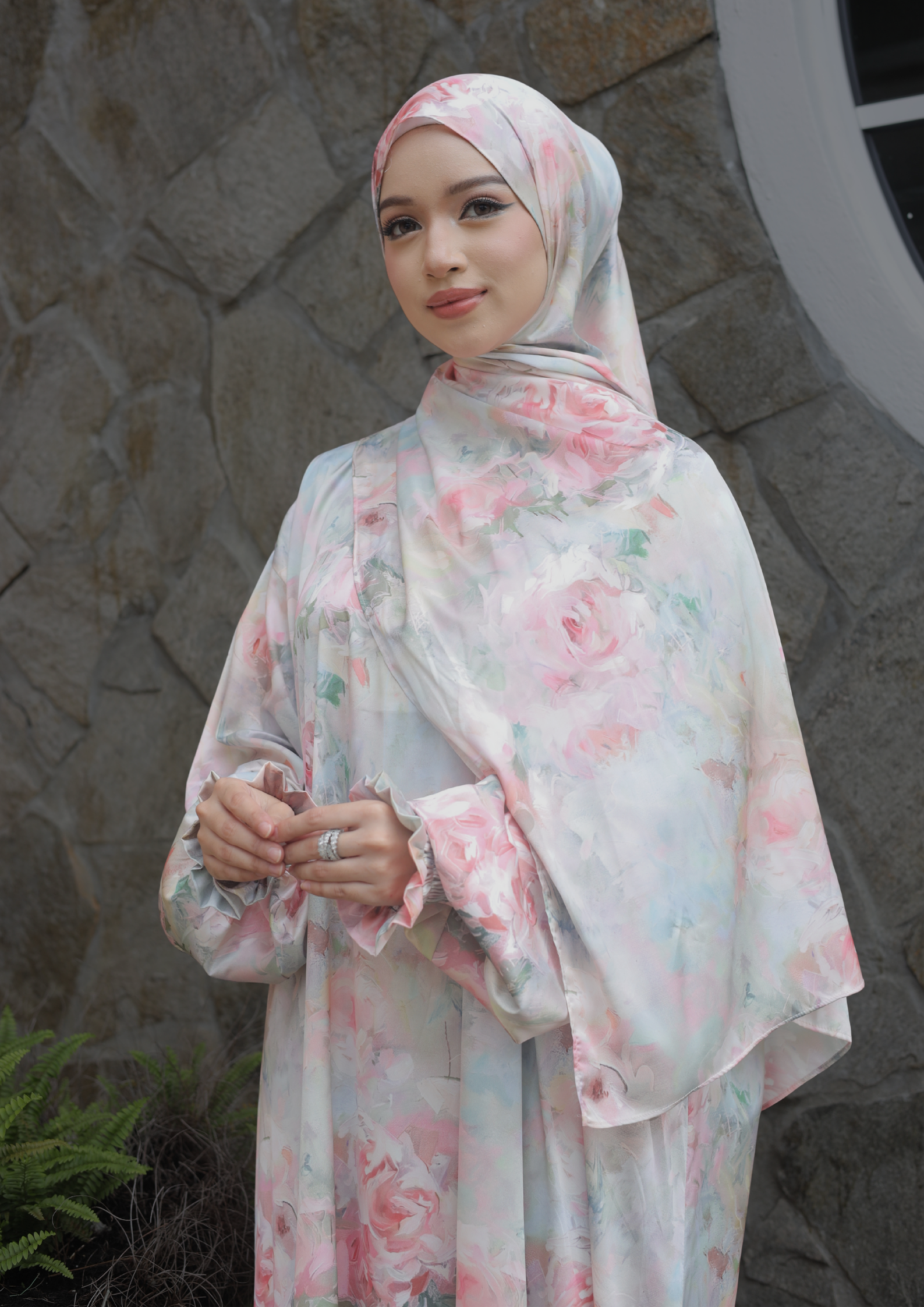 Crafted from premium satin silk, this printed abaya features a smooth, silky texture with a soft sheen that flows beautifully with every movement. The elegant print adds depth and character, creating a refined statement while maintaining a graceful and modest silhouette. Lightweight and comfortable, it is designed to elevate your Raya look with effortless elegance — perfect for both festive moments and timeless wear.