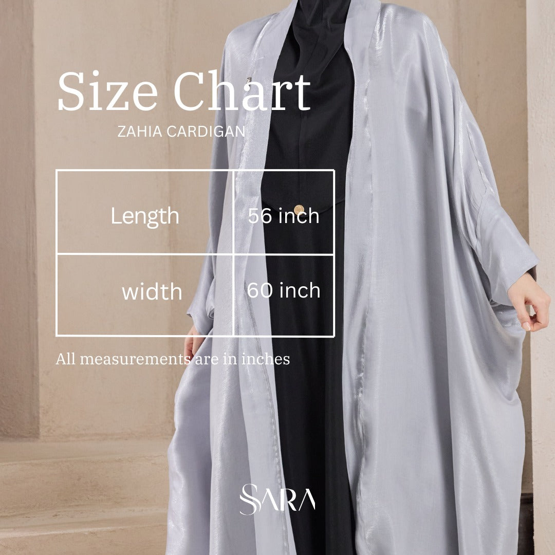 Experience our latest addition to our Raya Collection: Zahia Shimmer Cardigan. A masterpiece designed to elevate your look this Eid. Featuring an open style abaya concept with soft to the touch premium shimmer silk fabric. Indulge in the perfect flow of this grand piece, featuring all new colours from a classy bronze to a show stopping burnt orange, guaranteed to be your new favourites. Dress it casually with jeans and your favourite top or dress it up with a staple inner dress!